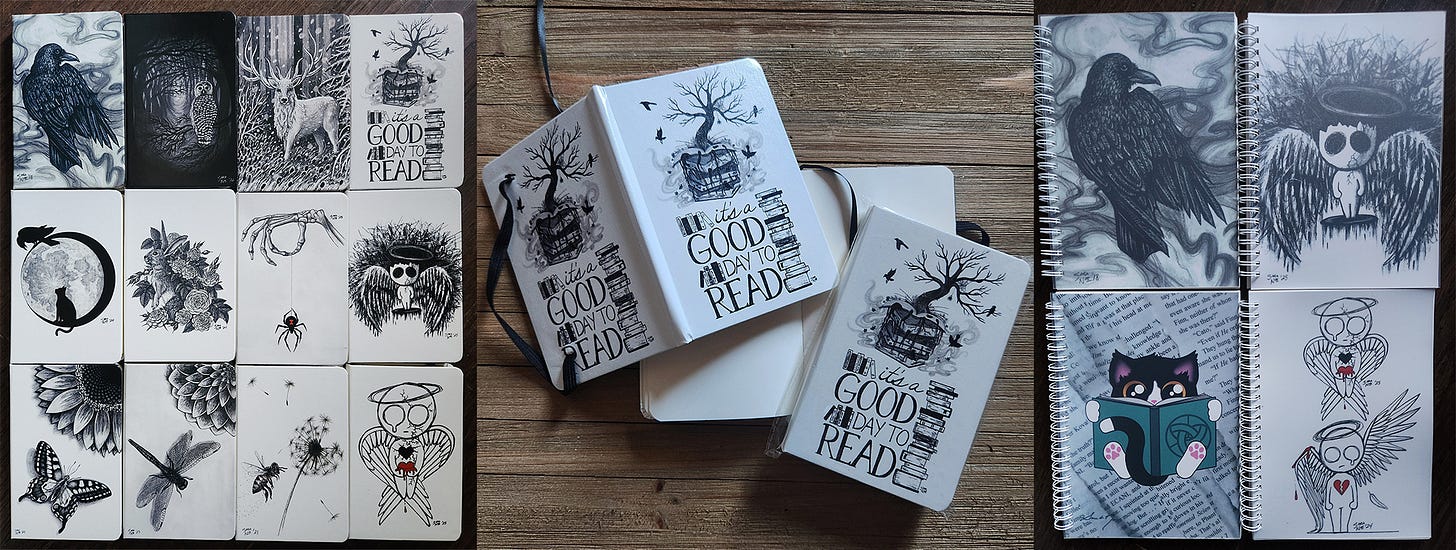 I’m excited to offer twelve of my art prints on cute little pocket journals, plus four of my art designs on larger spiral sticker books that have blank pages made of special release paper, allowing stickers to be stuck on and peeled off the pages repeatedly without causing them to lose their stickiness.
